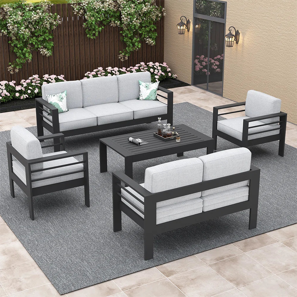Inspired by the clean-lined silhouettes of contemporary indoor sectionals, our Outdoor Aluminum Furniture Set features deep seats for hours of comfortable lounging. Made from high-quality solid aluminum tubing, this collection is complemented by thick, padded soft cushions for luxurious comfort. It's a beautiful addition whether in your garden, patio, porch, poolside, or other outdoor space!