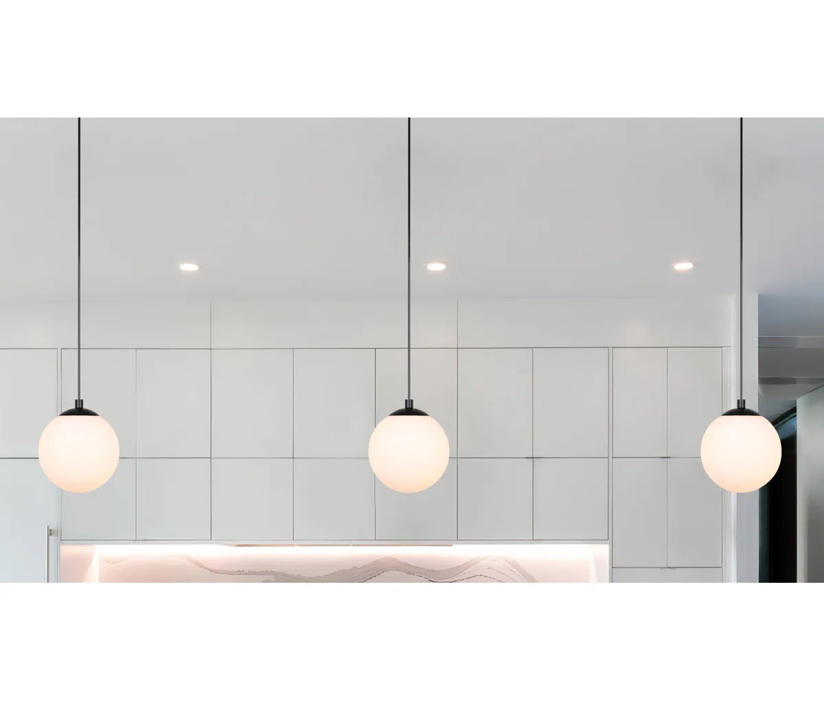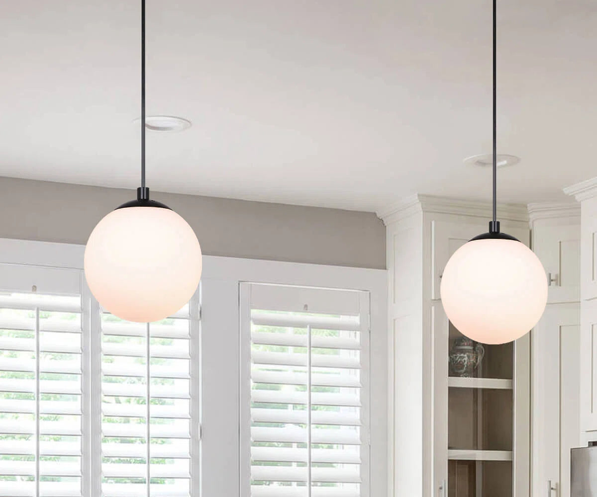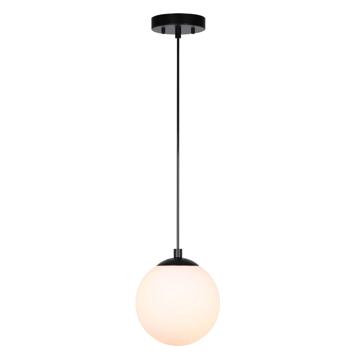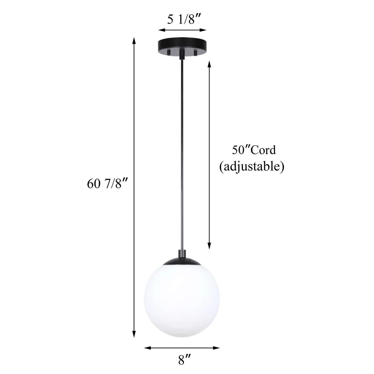 About This Product This 1 Light Pendant light features a sphere-shaped glass; The stylish round white glass emits a tranquil glow to brighten your room and your senses. Pendant light fixture with integral swivel for sloped ceilings, which works well in an entryway or dining area, or anywhere in your home.Suitable for Damp Locations.Also this pendant light with adjustable hanging stems, which allows you to customize the fixture to your lighting needs and desired look. Features Dimensions: W: 8" x H: 60-7/8" Max Height - Includes 50" Adjustable Cord Medium base socket Takes one maximum of 60-watt Medium base bulb (incandescent or LED compatible). Bulbs are not included Feature: Hardwired, this cord pendant features a spherical white glass shade in matte black and satin brass finish. Its sphere-shaped glass and sculpted metal lamp create a modern but simple look. Simple design: Adjustable Pendant light fixture with white globe glass works well in many different styles of decor including traditional, transitional, beach style, or contemporary This item is an indoor product.