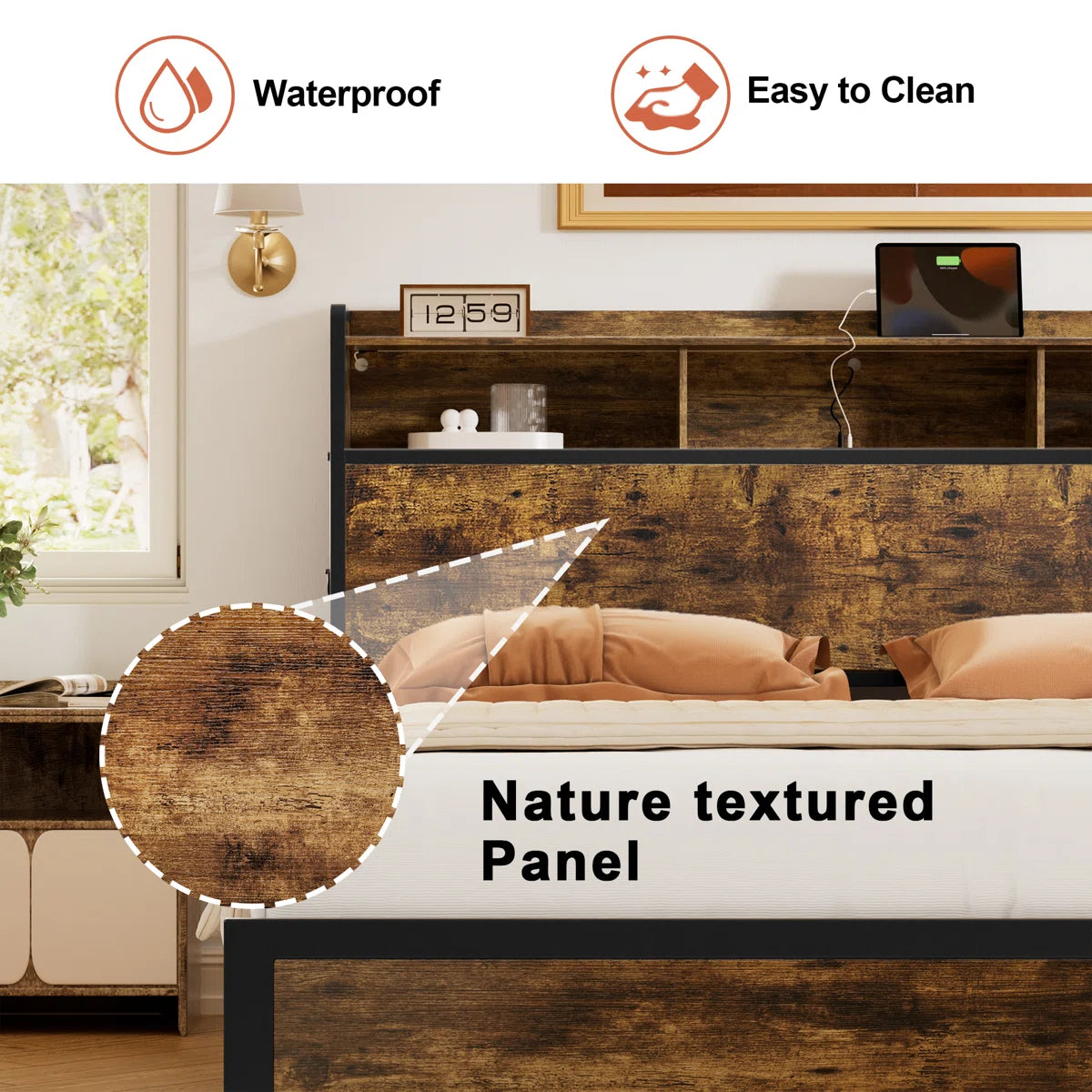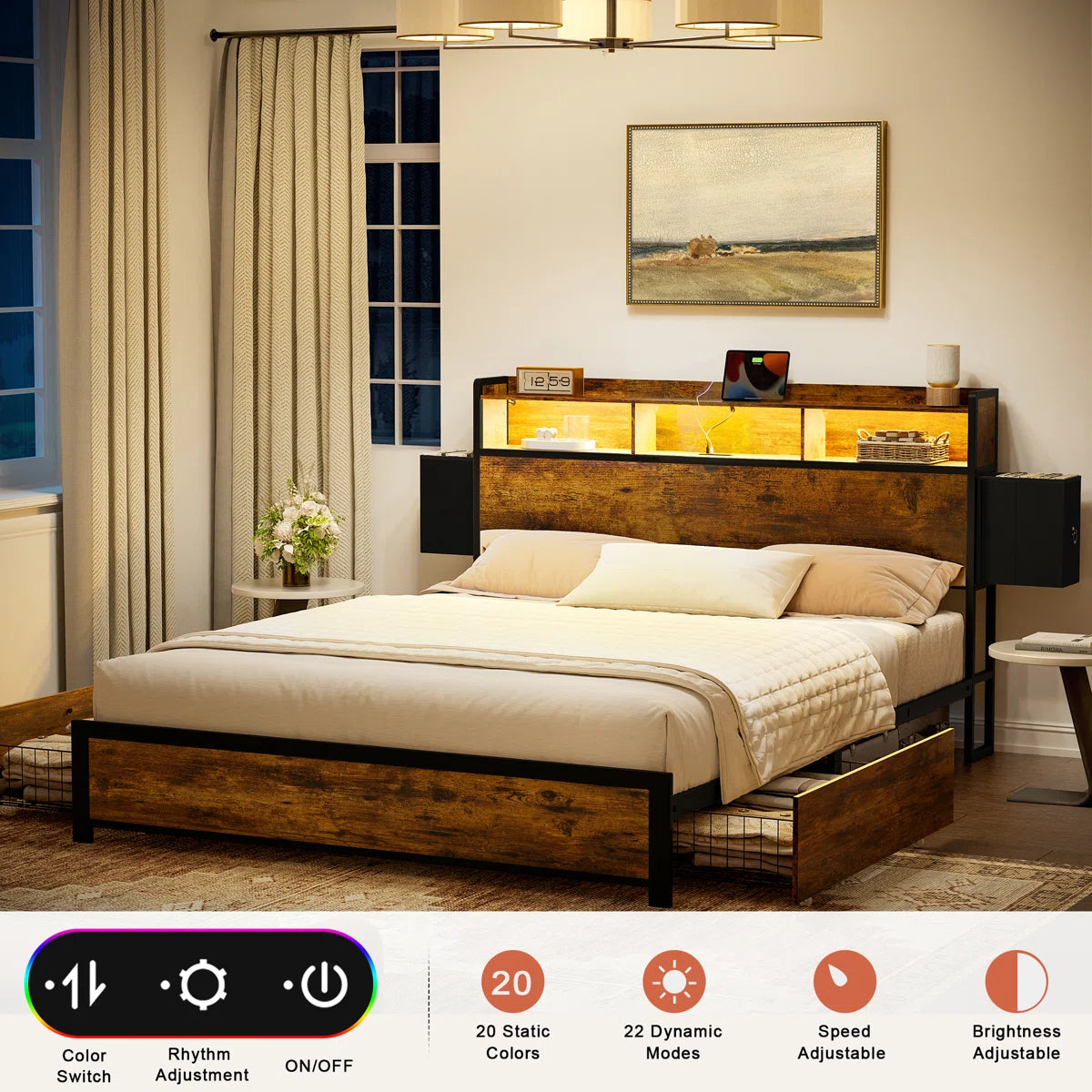 Antioch Queen Bed Frame with 2 Underbed Drawers & 2 Bedside Drawers, Modern Platform Bed with Charging Station & LED Light, Storage Headboard with Open Bookcase Shelves, Rustic Brown