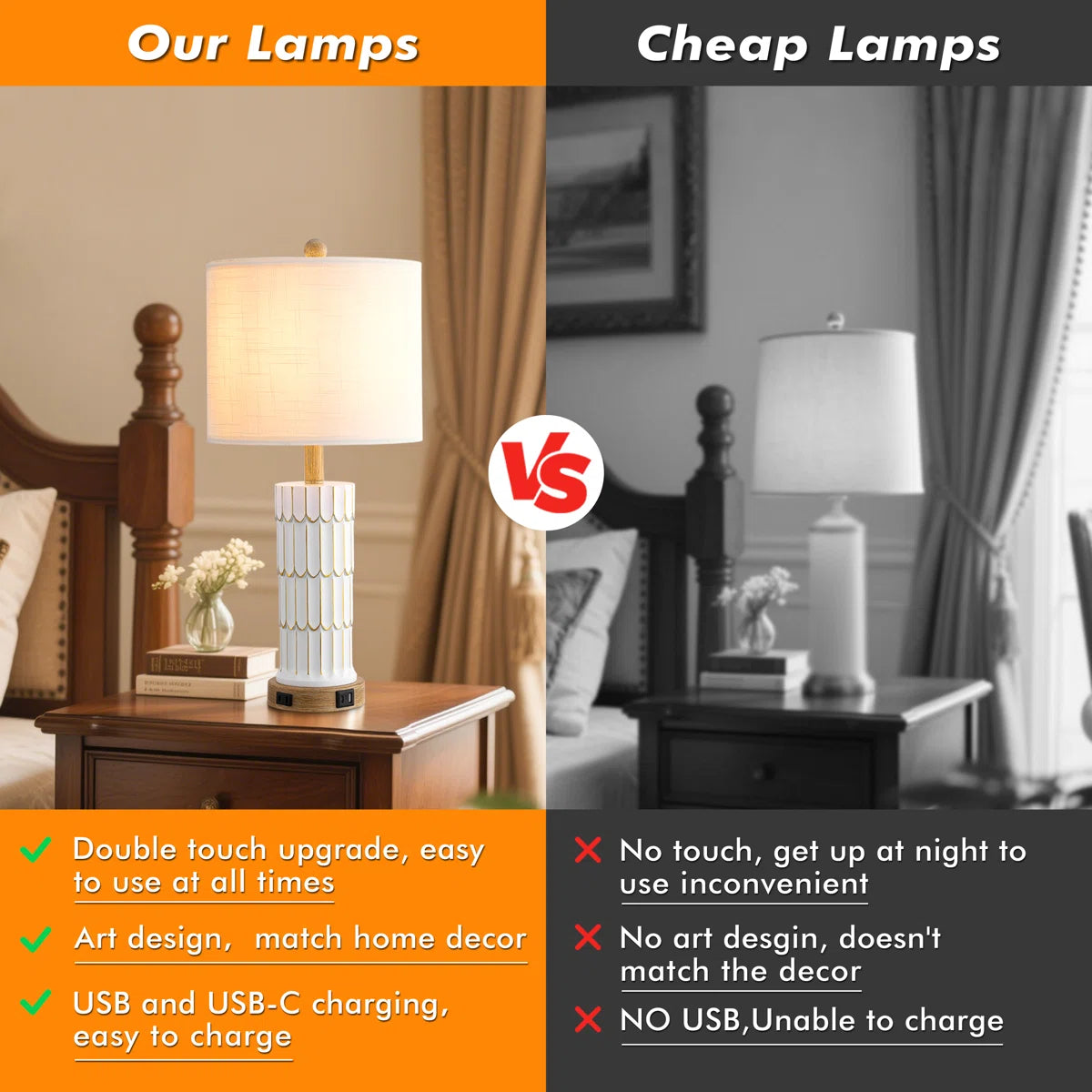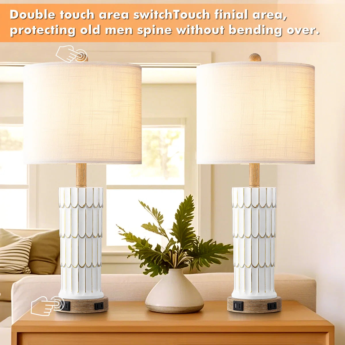 • Featured with USB and Type-C Charging Ports: The bedside table lamp comes with USB and Type-C ports(5V/2.1A) and 1 AC outlet(120V). You can easily charge your mobile phones, Kindles, watches, laptops, and any devices that need to be charged. They are available for use whether the lamp is on or off as long as the table lamp is plugged in. Reducing the clutter of extra power cubes or sockets while making your end table clean and tidy.