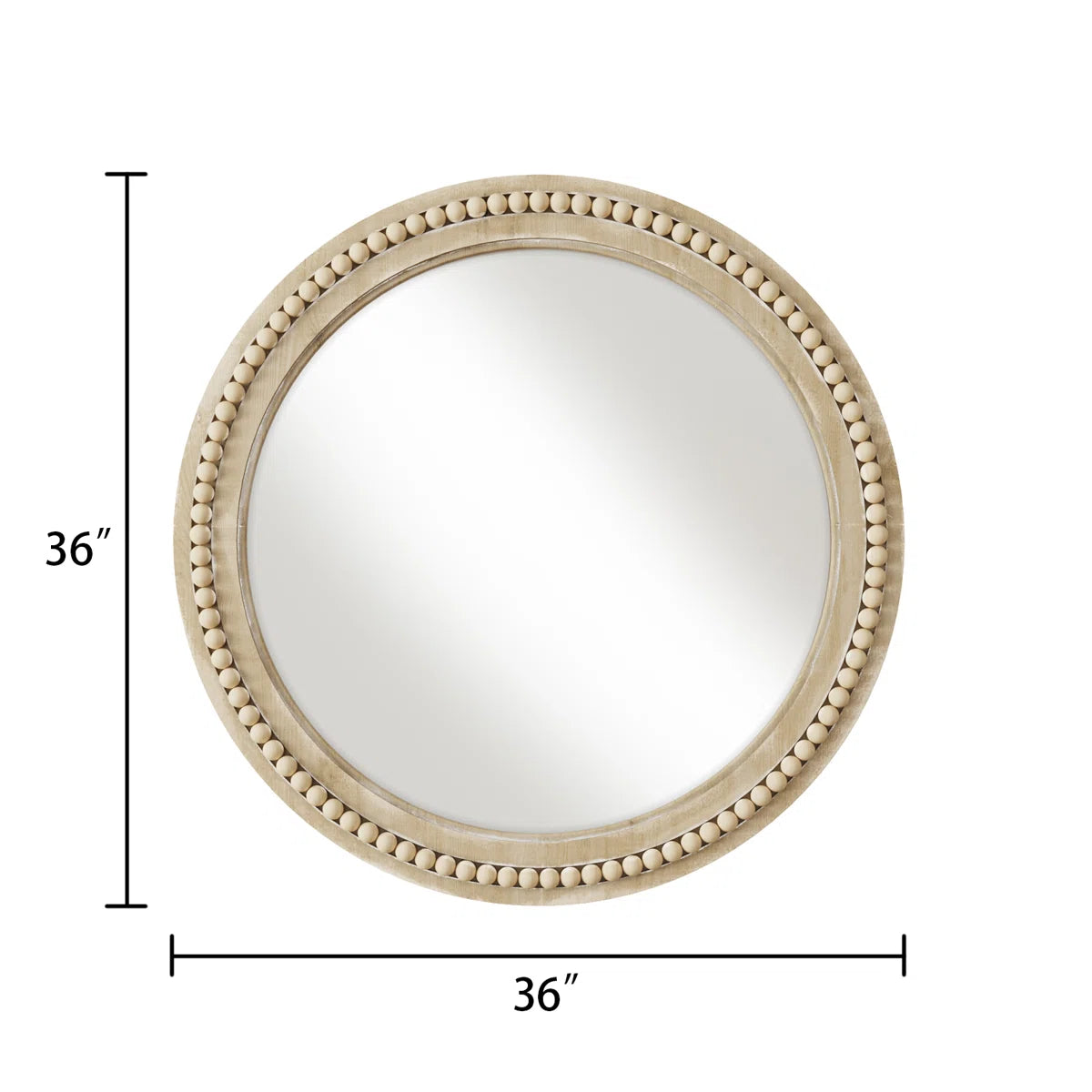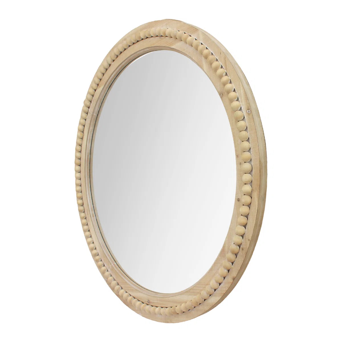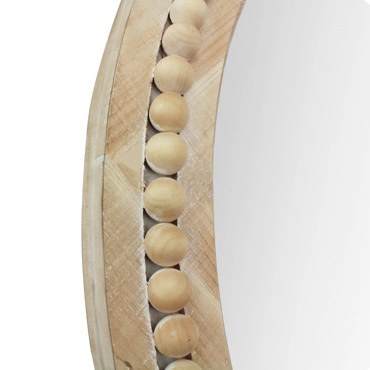 This hand-carved wood wall mirror is ornamented with dozens of small wooden balls.A natural brown hue adds a breeze touch that works with any contemporary aesthetic.The frame is crafted from solid wood with a natural texture that brings out the wood grain for a mix of farmhouse and French-country styles.This accent mirror makes an eye-catching statement anywhere in your home.