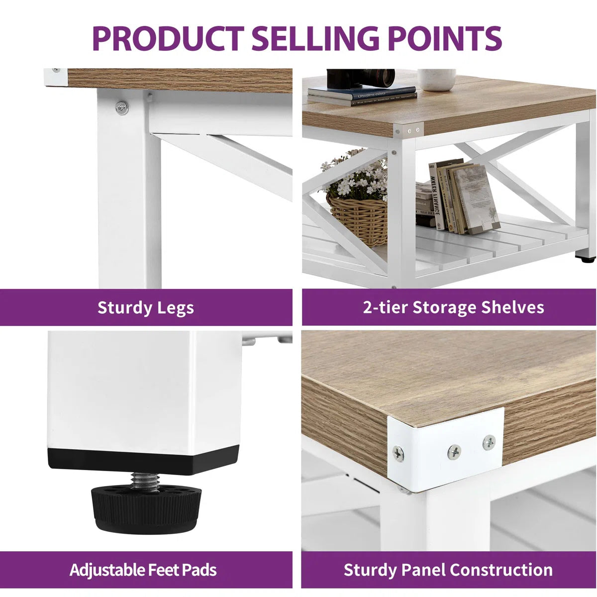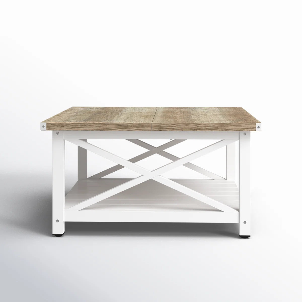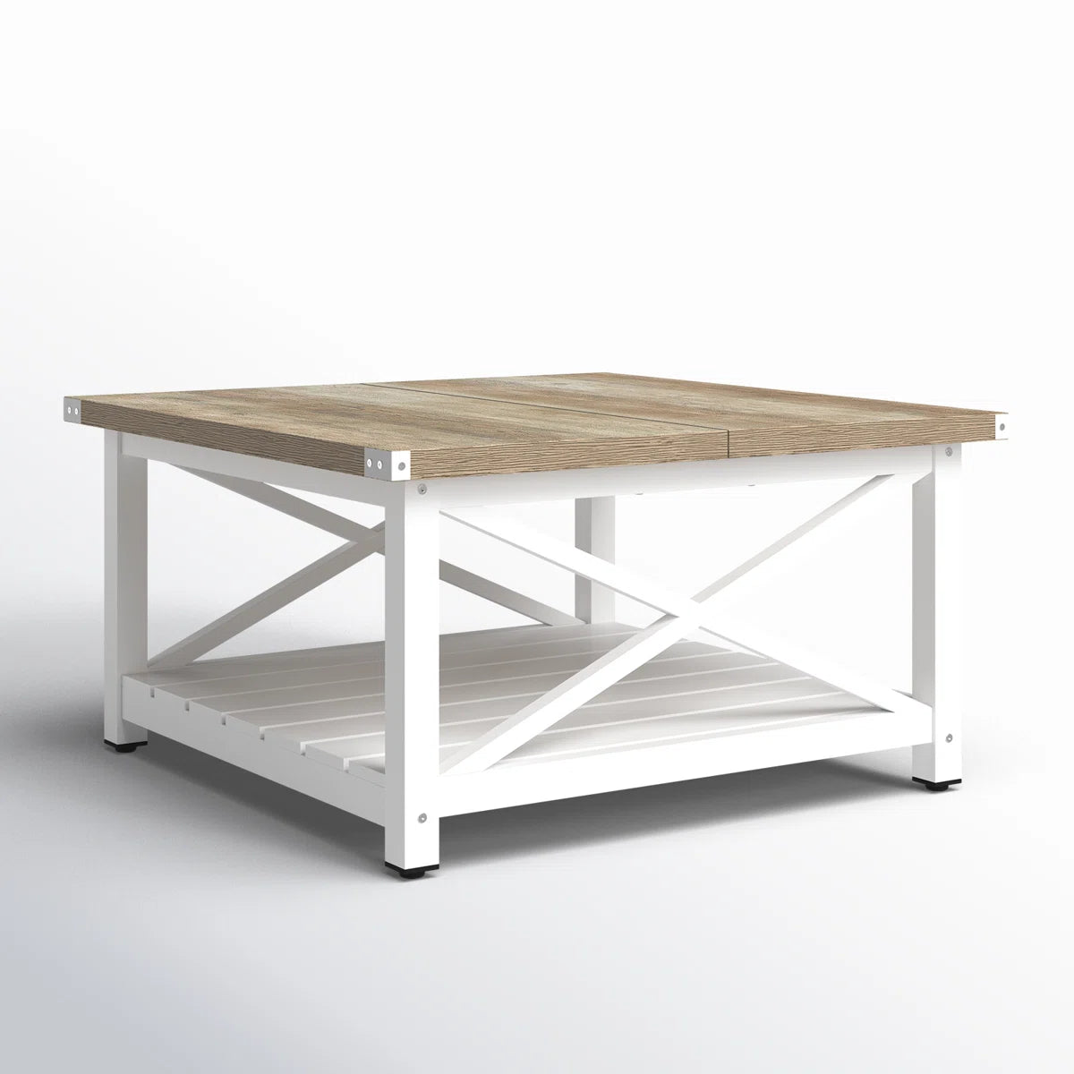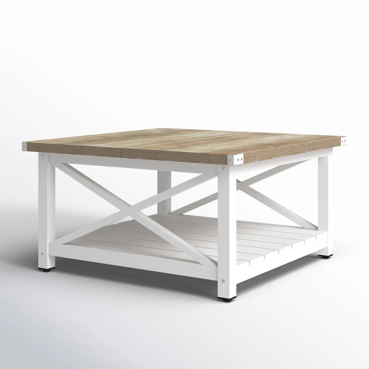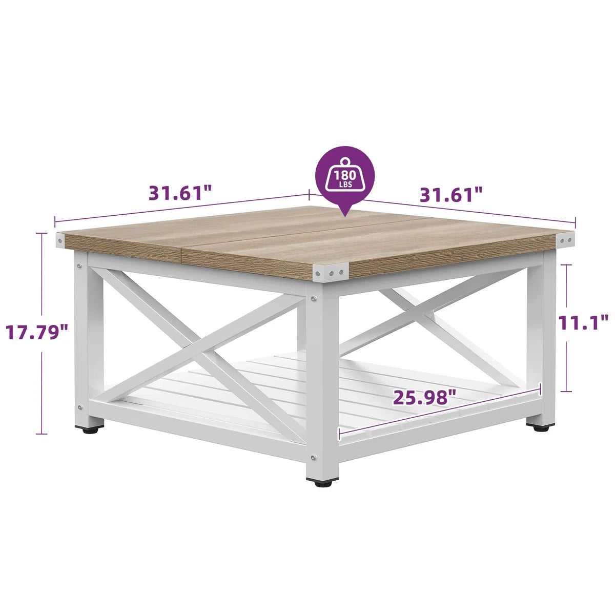 This coffee table brings rustic details and neutral hues to your living room. It's made from engineered wood and iron with a two-tone finish for plenty of inviting contrast. Barn-inspired detailing including crossbuck openwork on the sides and a planked lower shelf completes the modern farmhouse aesthetic. Measuring approximately 31.5" square, there's plenty of room on top for magazines and remotes, while the shelf underneath is a great place to tuck away books, baskets, and board games.