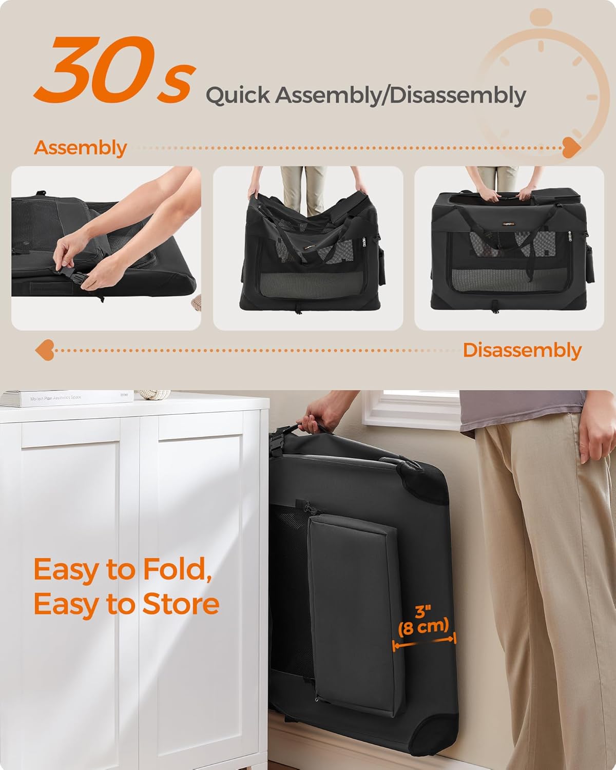 QUICK ASSEMBLY & EASY FOLDING The dog crate can be assembled in 30 seconds without tools and can be stored in the car or in the corner of your home after folding. It can be easily carried for indoor use or traveling, giving your dog a warm home anytime ANTI-ESCAPE & STRONGER Featuring self-locking zippers that ensure pets can't open it from the inside, the travel dog crate enhances safety while traveling. The thick steel frame and Oxford fabric are scratch- and tear-resistant for prolonged service life 3 DOORS The collapsible dog crate has 3 doors and good ventilation to ensure comfort. Whether indoors or outdoors, the soft fleece pad inside allows your dog to enjoy a cozy sleeping environment EASY CLEANING & PRACTICAL STORAGE The Oxford fabric surrounding this portable dog crate is water-resistant, so stains can be easily wiped away. The fleece pad is removable for cleaning (inner padding not washable). 2 pockets keep snacks and leashes handy CHOOSE THE RIGHT SIZE This 32 x 23 x 23 collapsible dog carrier is ideal for pets between 35-50 lb. Please read our tips on the pictures to measure your pet and choose the right size