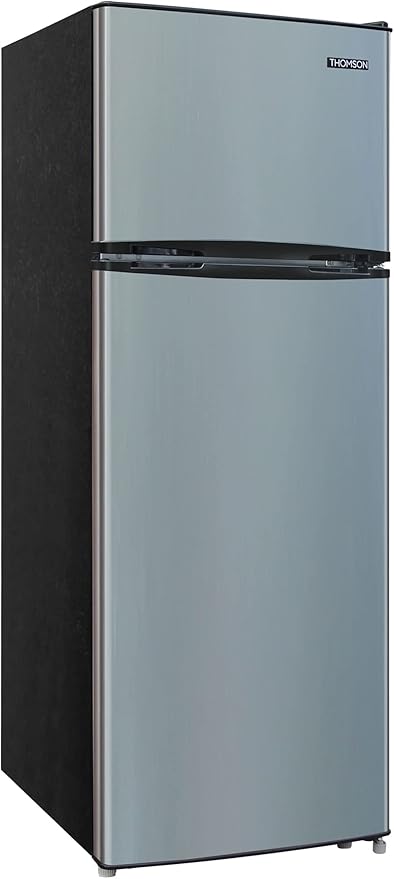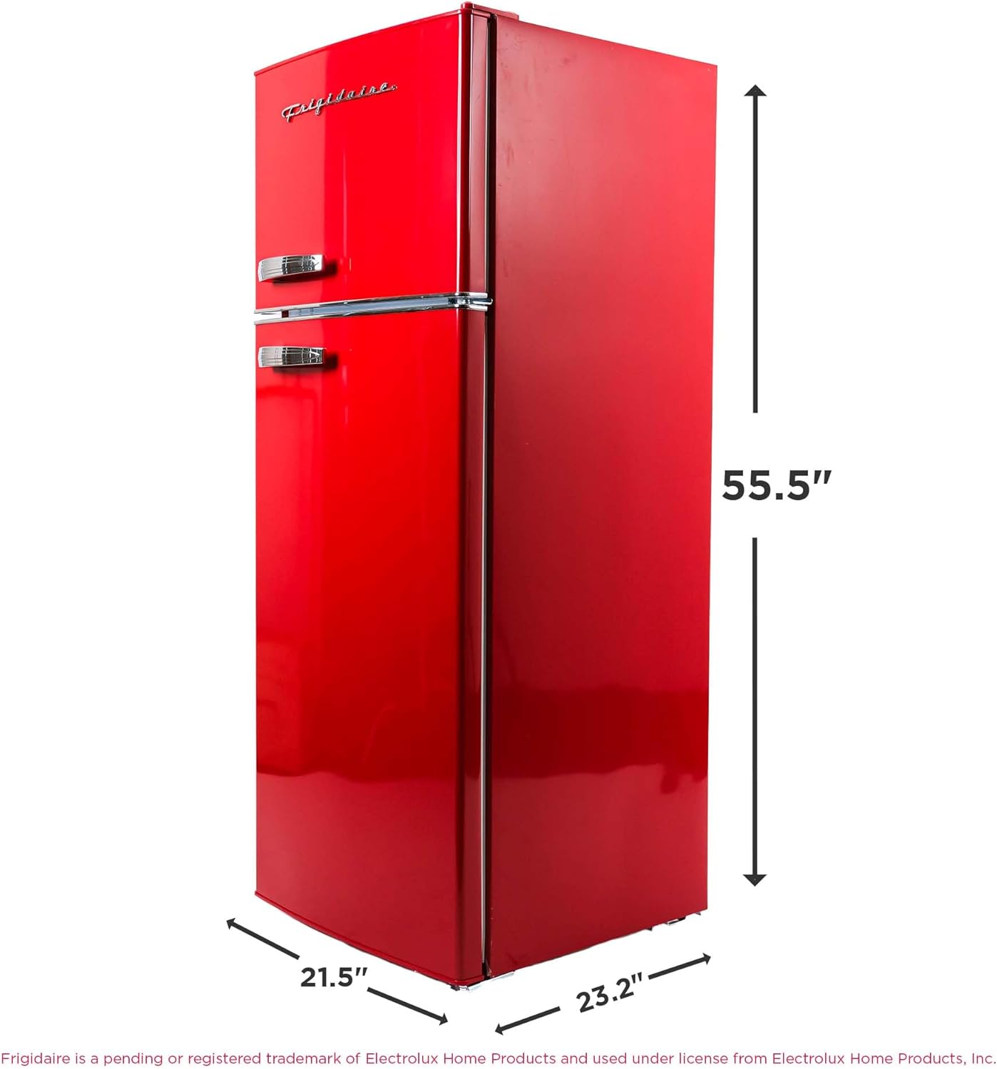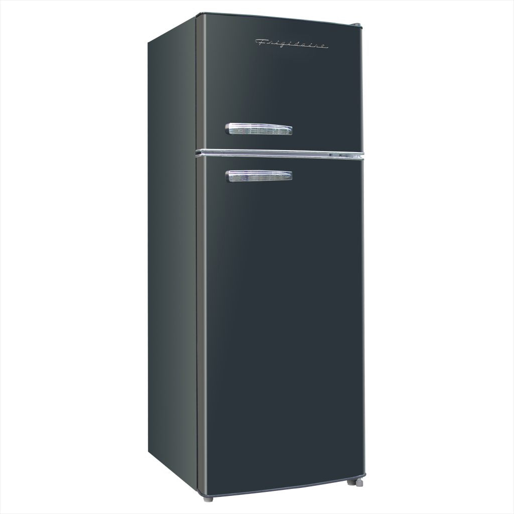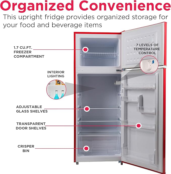 Retro Style Meets Contemporary Comfort The Frigidaire Retro Refrigerator seamlessly blends retro aesthetics with modern convenience thanks to its sleek stainless steel finish, classic chrome trim, and vintage-inspired pull handles. Stylish and functional, this small fridge freezer comes with ample storage including three adjustable, slide-out glass shelves, a transparent vegetable crisper, and four clear door shelves. The separate freezer compartment provides even more storage space for your frozen items, making it great for smaller spaces where every inch counts. Top Features: • Upright fridge freezer combo • 7.5 cu. ft. capacity • Multiple storage compartments • Stainless retro finish with chrome trim • Dimensions: 23.2"D x 21.5"W x 55.5"H Spacious Storage With its 7.5 cu. ft. capacity and a separate freezer compartment, this apartment size fridge offers ample room for all your food and beverage items. The upright, compact design makes it great for smaller spaces including dorms, condos, garages, and cabins. Enhanced Organization The small fridge comes equipped with three removable glass shelves, a transparent vegetable crisper, and four clear door shelves for organized storage that maximizes space and keeps everything easily accessible. Effortless Placement This compact fridge is thoughtfully crafted with two front-mount adjustable leveling legs and two castors expertly mounted at the back for easy maneuverability and positioning in any space.