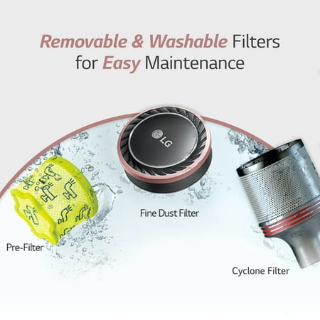 Removable, Rechargeable Battery up to 50 Minutes - The LG Cord Zero A9 Cordless Stick Vacuum A912PM boasts strong suction and a detachable quick-release battery for up to 50 minutes* of long-lasting cleaning performance. *In normal mode without Power Nozzles Portable Charging Stand - Easily store and charge anywhere, anytime without drilling holes into your wall. Control Features With a Single Touch - Turn the vacuum on and off or change power levels with the touch of a thumb, without cramping your hand. Removable, Washable Filters for Easy Maintenance - Unlike other vacuums that only let you remove the filter, LG Cord Zero lets you remove both filters and the cyclone system to clean away dirt and keep your vacuum running at its best. Adjustable Wand Length - The adjustable telescopic wand allows for more flexibility and conveniently stores away to save space. 5-Step Filtration System - Helps to filter 99. 99% of dust by separating suctioned dust in the dust bin, then filtering the remaining fine dust. Clean Carpets and Hard Floor Surfaces with Ease - The Universal Power Nozzle effectively lifts dust, dirt, and pet hair from hardwood floors and carpets thanks to the direct-drive motor inside the nozzle cleaning head. Transforms to Hand Vacuum - Detach the hand vacuum for quick and easy spot cleaning. Easily switch between floors and furniture with the versatility of the detachable handheld vacuum.
