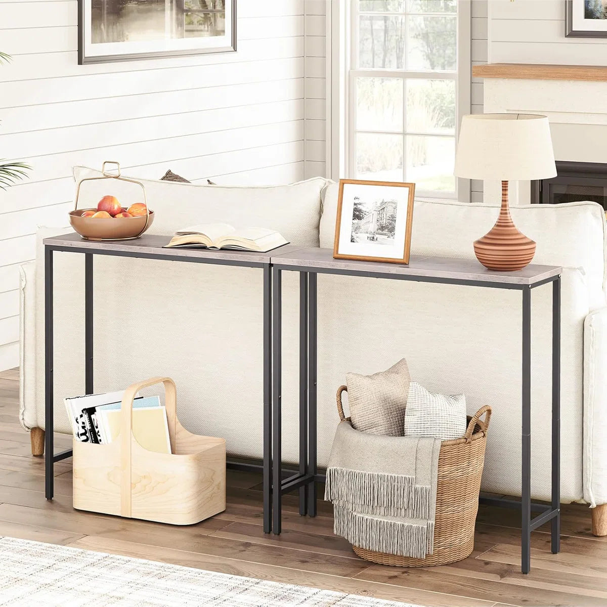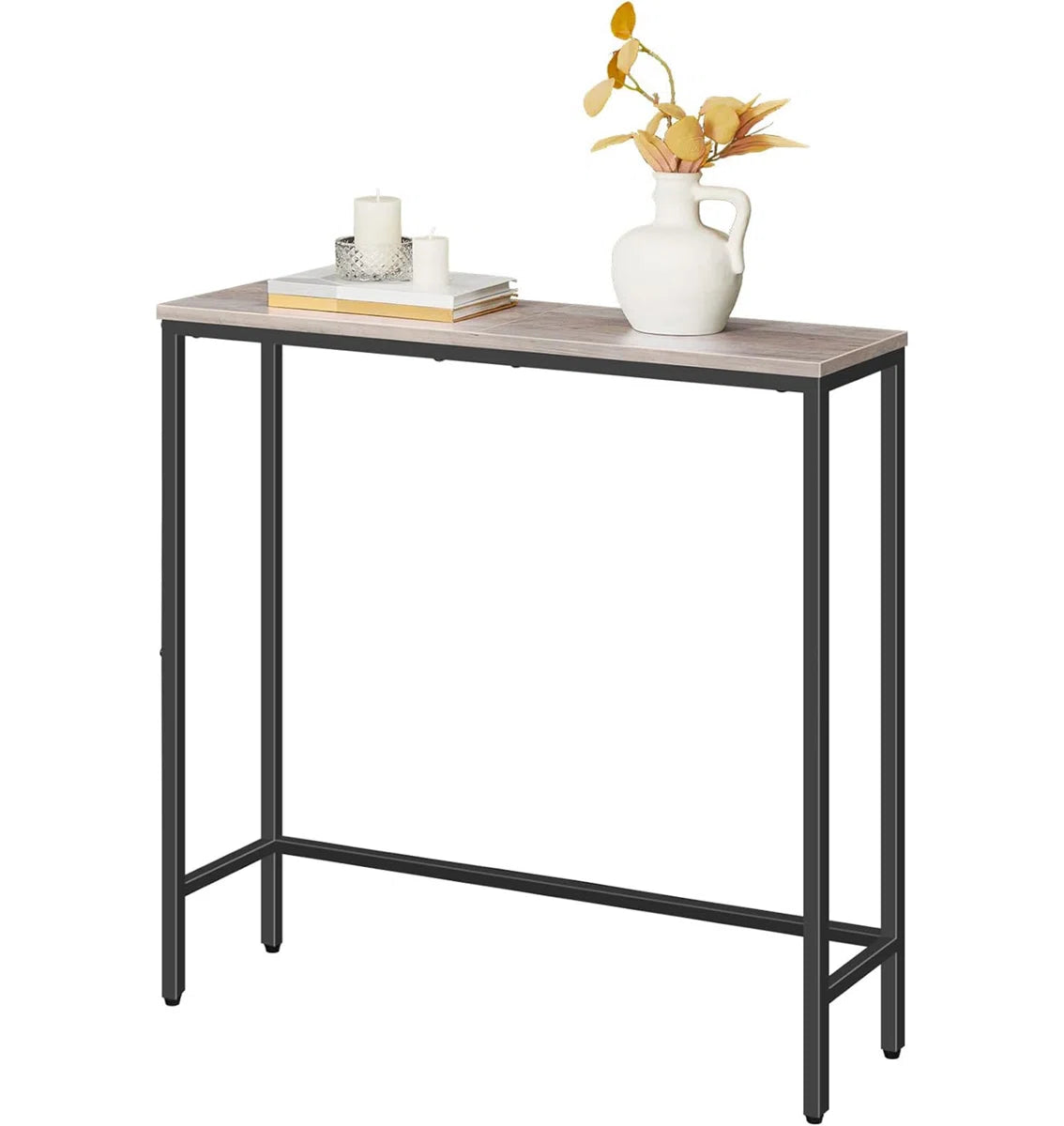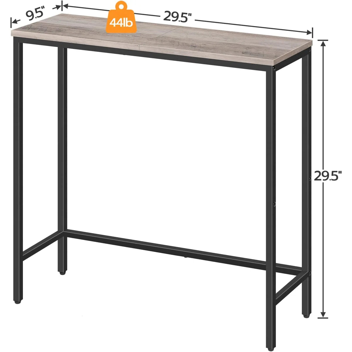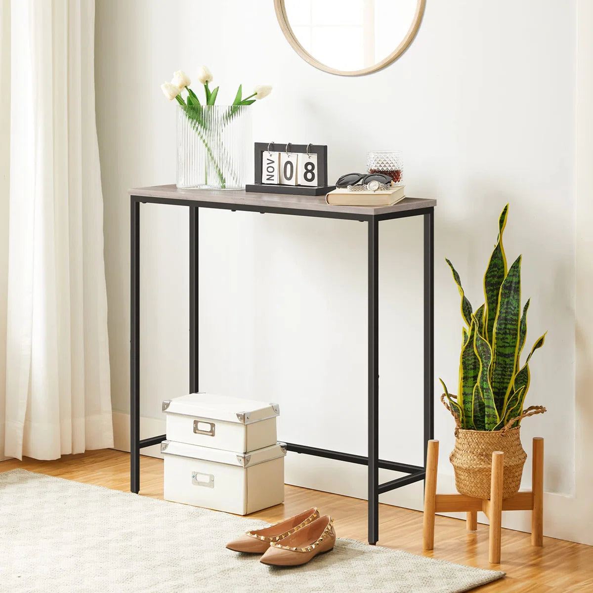 About This Product Merging a rustic modern look with a bit of industrial style, this console table is a convenient addition to any room in your home. It has a clean-lined frame crafted from black-finished iron, and it rests on four slender legs with a stretcher bar for extra stability. The rectangular table top is crafted from engineered wood with a bold finish, giving you plenty of space for framed photos, vases, and other decor. At just under 30" tall, it fits nicely behind your living room sofa or against the wall in your entryway. Features Multifunctional Console Table: The end table cannot only be placed at the entryway to store keys, magazines and a hallway lamp, but also be put near the window to display plants you love. Meanwhile, it is also the best side table and sofa table when you want to put it in the living room Sturdy black metal frame with powder coating; durable and stable; high-quality wooden table top Perfect Partner for Small Space: The console table with a size of 29.5" Lx9.5" Wx29.5" H is perfect to put behind the sofa, in the kitchen, study, meeting room, entrance and hallway What's more, you also can get larger storage space when you put these console tables together Durable and Sturdy: The console table top and wooden shelves adopt quality particleboard, which ensures a long time use. The sturdy metal frame and 4 adjustable feet ensure stable use of the console table on floors that are not 100% flat Modern Industrial Style: metal frame combined with wooden panels can go well with many different colours, the console table making your study or bedroom more charming Multifunctional Design: Ideal as an entryway table, side table, sofa table, or plant stand for versatile use. For small spaces: Compact size (9.45"D x 38.19"W x 29.72"H) with big functionality. Modern Industrial Style: lack metal frame combined with wooden panels can go well with many different colours, the console table making your study or bedroom more charming Sturdiness: High-grade medium density fiberboard and strong metal frame with adjustable feet ensure stability. Quick to Assemble: Each part is dearly labelled and the instruction manual is comprehensible to eliminate the guesswork. You won t go wrong Weight capacity: Supports up to 110 lbs; suitable for various items and decorations.