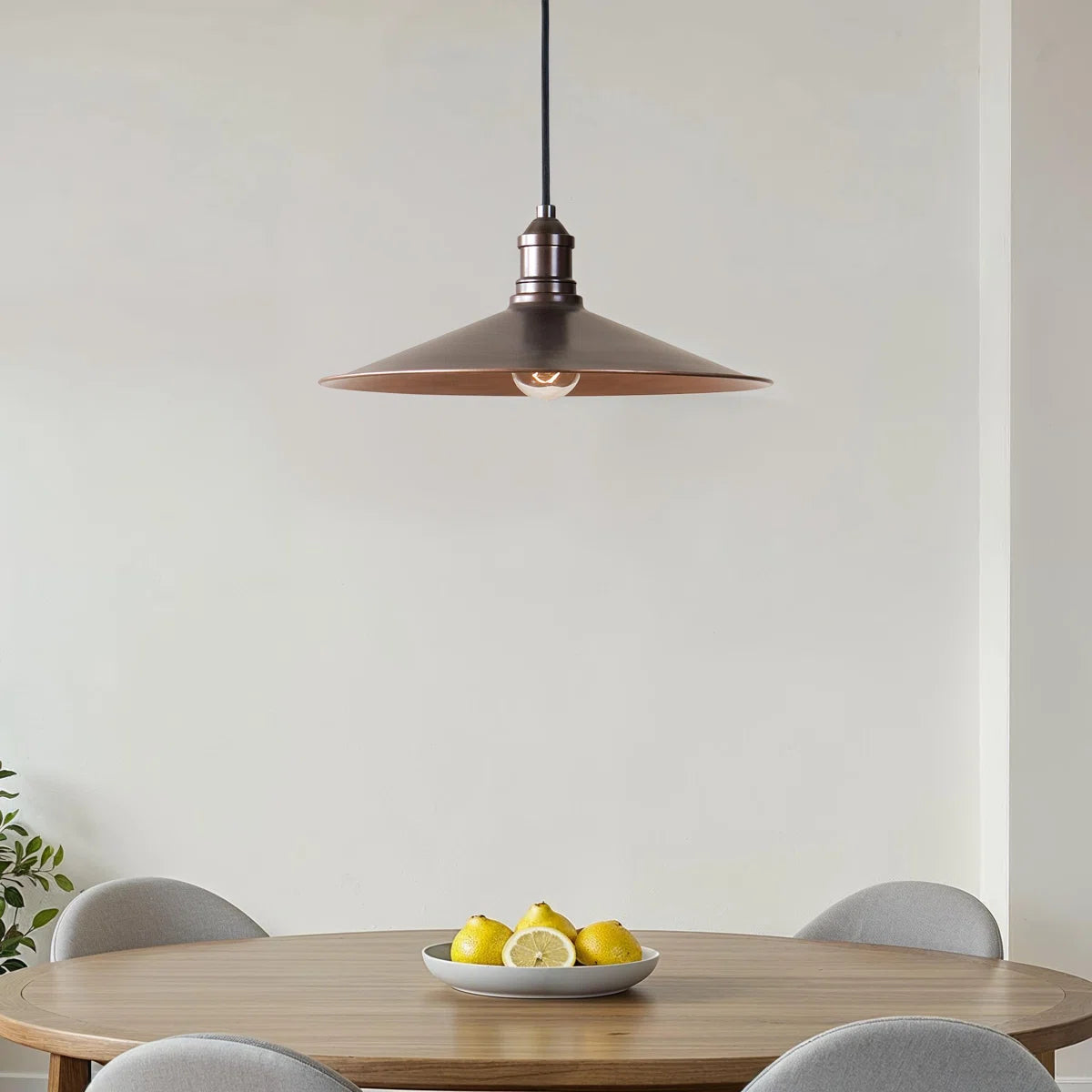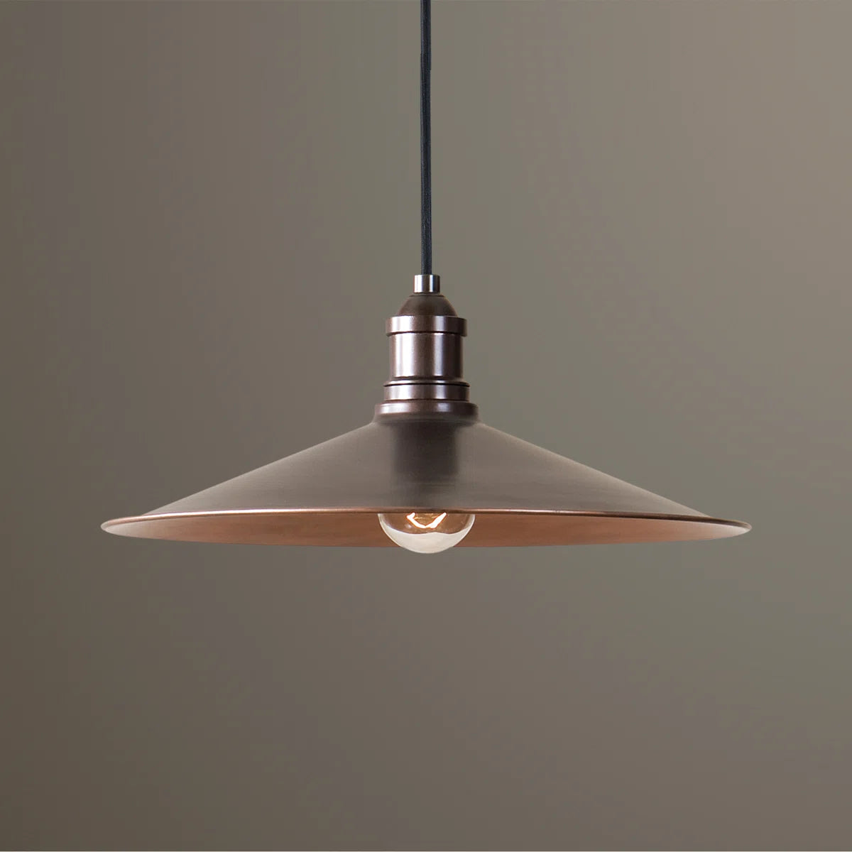 This 1-light pendant takes a distinctive farmhouse look and leans heavily on its modern elements. Crafted from metal with an antique copper finish, the fixture consists of a holder and a low-profile cone shade that directs light outward throughout your dining room or kitchen. A single 100W max bulb is required and sold separately. This pendant light hangs with the help of a height-adjustable wire that caters to your available space. A canopy is also included with this listing.