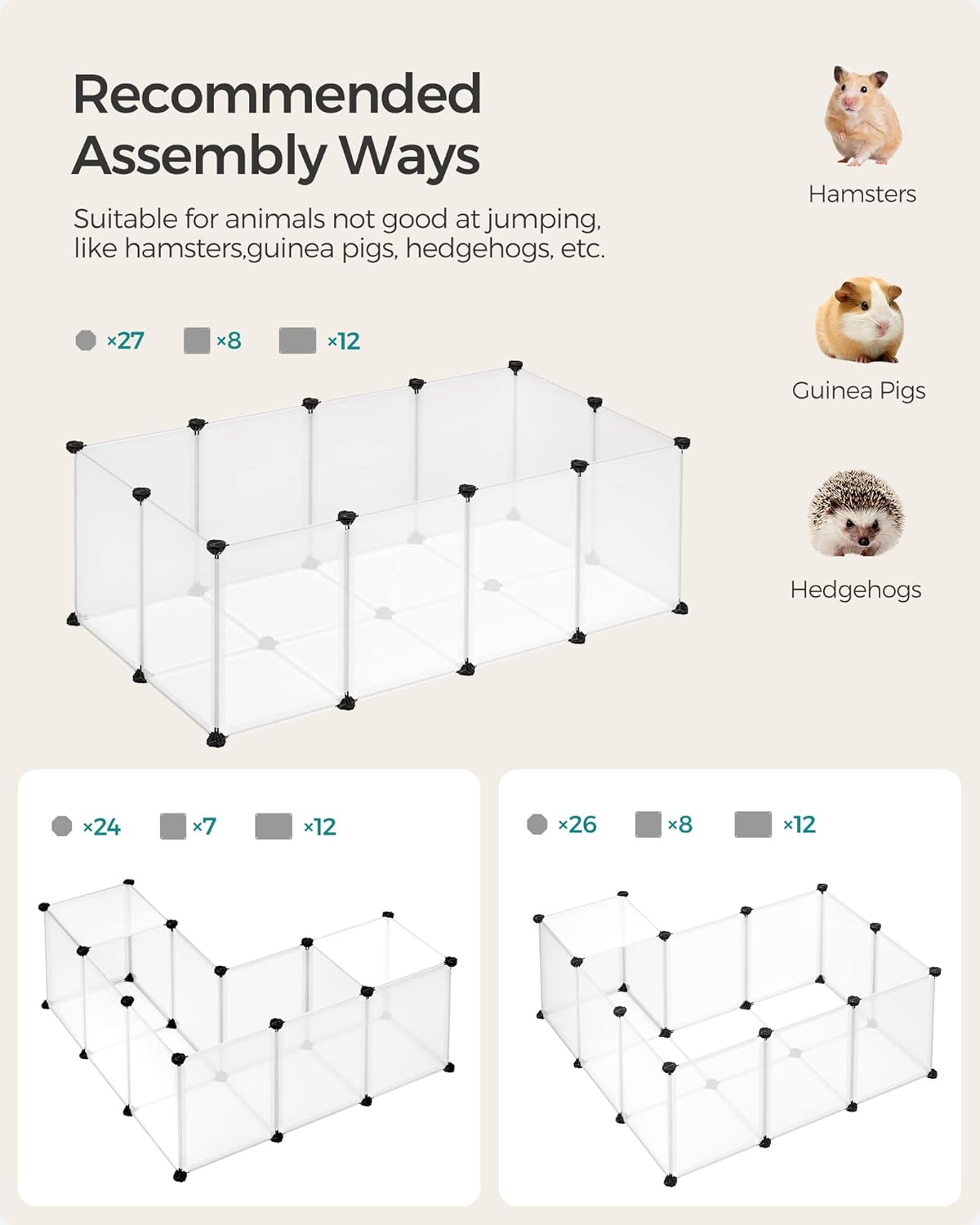 Assembly Is a Breeze Simply join the plastic panels with the multi-angle connectors with the help of the included rubber mallet, you ll quickly set up this pet playpen. The modular, lightweight structure also makes it easy to disassemble or move around Spacious and Secure This pet enclosure offers a roomy area for guinea pigs, hamsters, hedgehogs to run, explore, and have fun. The 15.7 x 11.8 and 11.8 x 11.8 smooth panels give them little chance to climb out Preventive Details The floor of this hamster cage not only enhances the stability but also offers effective protection for your floor. The plastic panels and connectors are firmly connected to prevent small animals from burrowing their way out Customizable and Expandable Arrange this flexible pen in an L-shape to fit your corner space or stack them into a 2-story pet house within the limit of the included parts. Please see the recommended assembly methods below for further details Semi-Transparent & Easy-to-Clean Through the translucent panels, you can see your furry friends groom themselves, stretch out, or even drift off into their dream land. To keep the pet fence clean, simply wipe the surface with a damp cloth