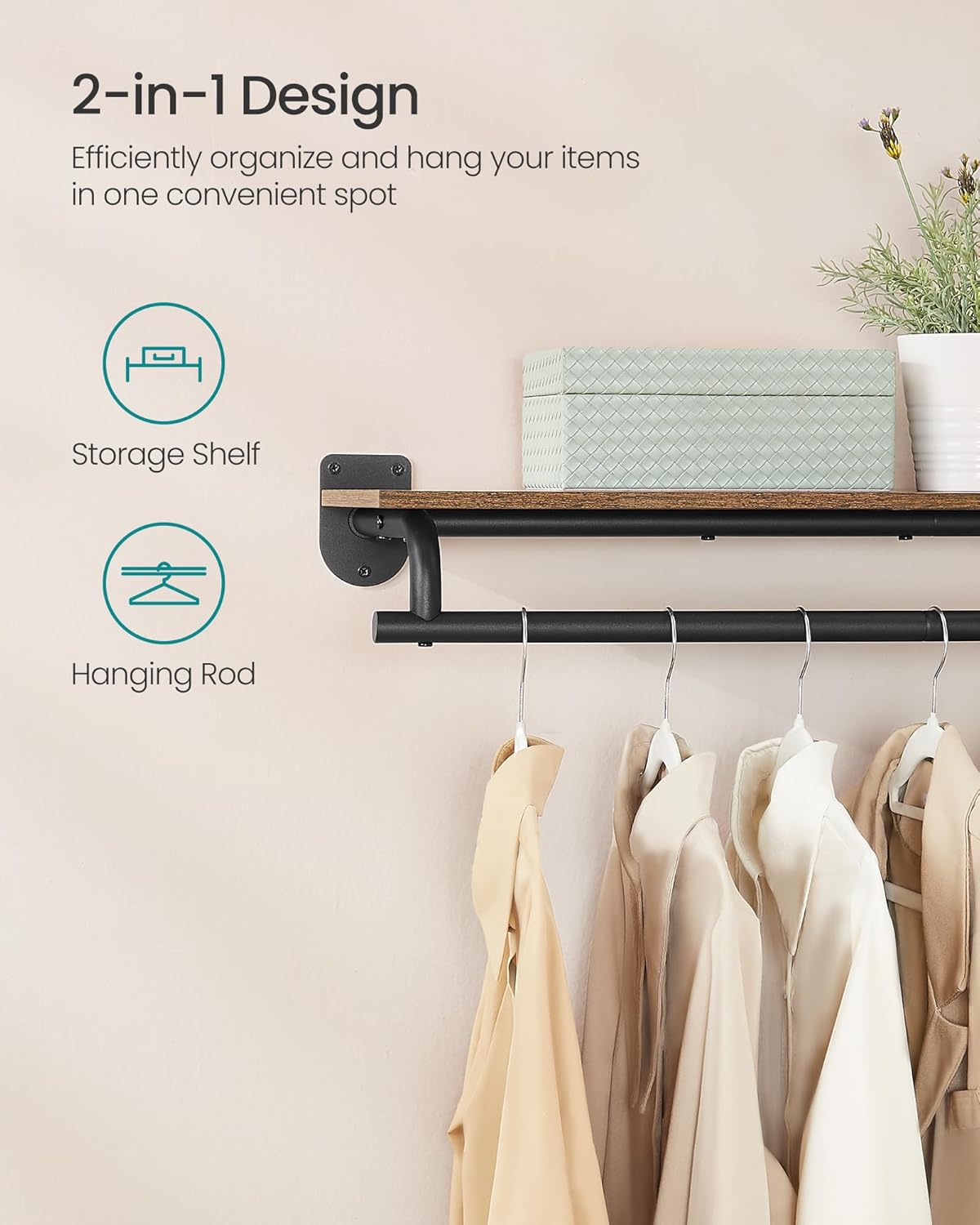 2-IN-1 CLOTHES RACK Featuring both a shelf and a hanging rod, this wall-mounted clothes rack allows you to organize items and hang clothes in one convenient place, making tidying up more efficient HIGH LOAD CAPACITY Constructed from sturdy steel and premium particleboard, this garment rack can support up to 77 lb in total (shelf: 22 lb; rod: 55 lb) SPACE-SAVING This clothing rack maximizes unused wall space and doesn't take up valuable floor area, leaving more room for movement or additional furniture VERSATILE USE Ideal for the bedroom or walk-in closet to organize clothes, the laundry room to assist on laundry day, or the entryway to provide easy access to your essential items when heading out DECORATIVE DESIGN With its modern and simple design, this shelf not only adds a decorative touch to your home but also provides the perfect stage for your collection of figurines, photo frames, and other decorative items