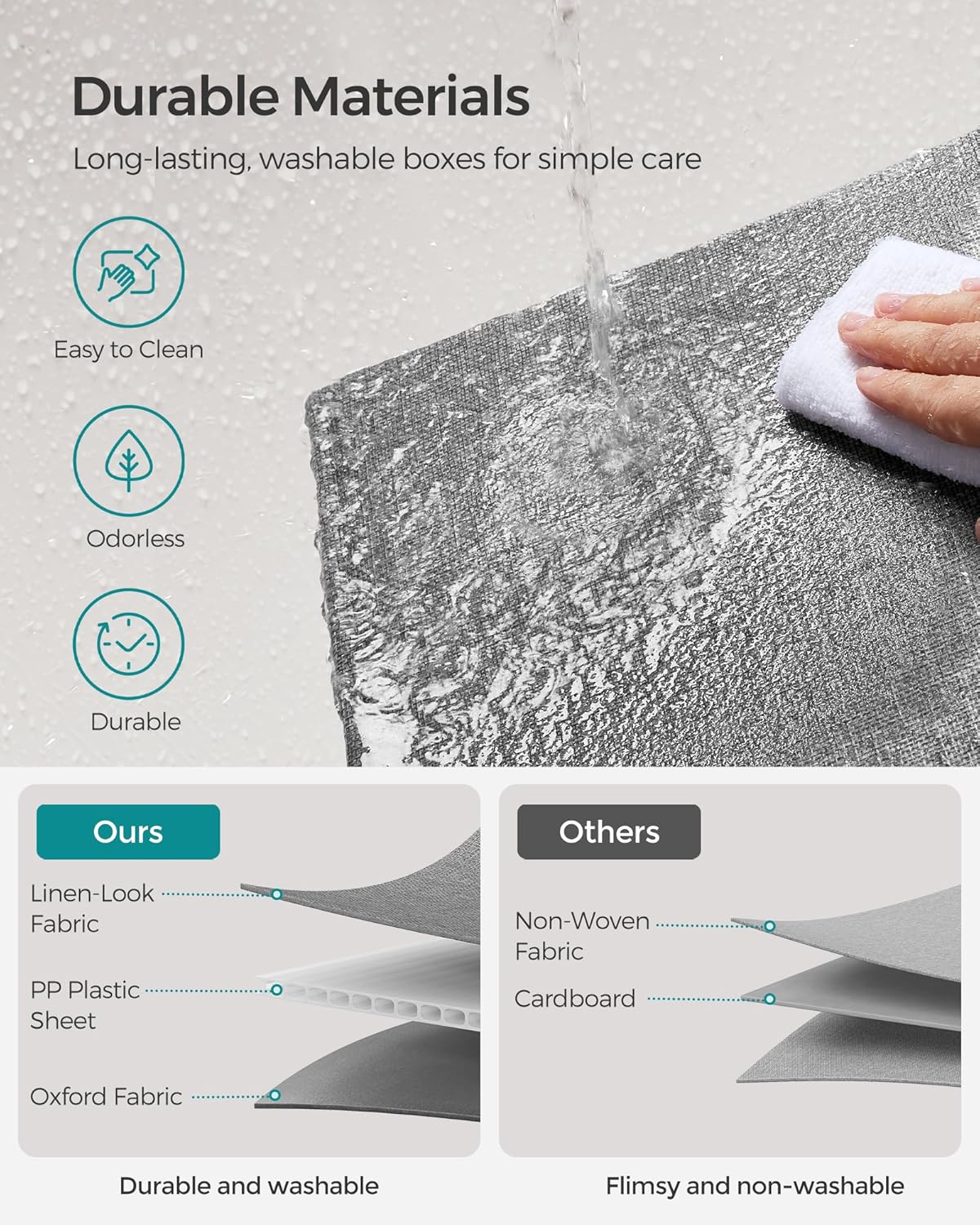 Durable & Odorless Made of sturdy linen-look fabric, Oxford fabric lining, and odor-free PP plastic sheets, these storage baskets can handle the demands of everyday use and provide a clean and fresh storage environment Simple to Keep Clean Cleaning these fabric storage baskets is a breeze. Just immerse them in water and use a soft cloth to gently remove stains Embrace the Ease These storage bins boast a movable metal label holder and spare labels, allowing for categorized storage and effortless item retrieval. The double handles make pulling and moving these boxes a convenient experience Optimize Your Space These closet organizers are perfect for closet partitions and layer racks, keeping your items organized. When not in use, they can be folded flat for easy storage, ensuring a neat and tidy look Versatile Storage Whether you're storing clothes, books, or those odds and ends, these multi-purpose storage baskets will provide a flexible solution for every room in your home