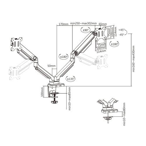 •Suggested Desktop Thickness: Clamp: 10~85mm (0.39"~3.3"), Grommet: 10~80mm (0.39"~3.1")