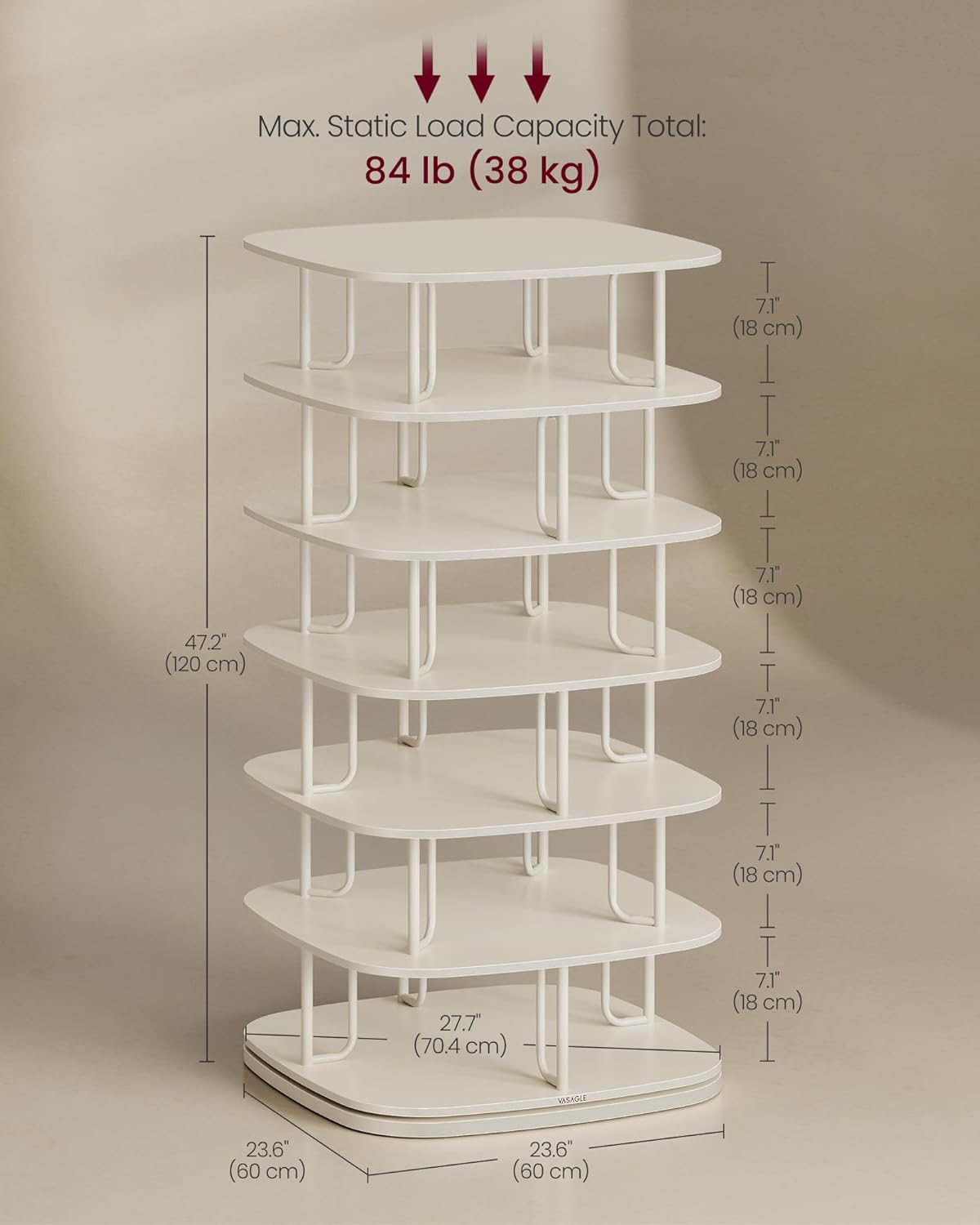 Title: VASAGLE 7-Tier Shoe Rack, Rotating Shoe Rack Tower, Shoe Closet Organizer, Shoe Shelf, 28-35 Pairs, 23.6 x 23.6 x 47.2 Inches, for Entryway, Living Room, Closet, Cream White ULBS041W01