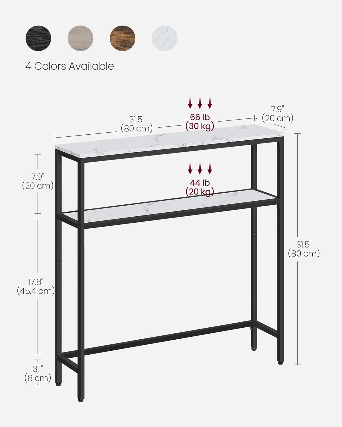 COMPACT YET SPACIOUS Measuring just 7.9D x 31.5W x 31.5H, this console table is a perfect fit for small spaces. Its 2 practical shelves provide ample room to neatly organize your books, potted plants, and daily items, ensuring a tidy and stylish home MODERN STYLE Featuring a black frame paired with particleboard panels in a marble white finish, this narrow entryway table blends seamlessly with modern decor and enhances the visual appeal of your home STURDY AND STABLE Crafted from robust particleboard and a steel frame, this entry table can hold up to 66 lb on the top shelf and 44 lb on the lower shelf. Adjustable feet ensure stability on uneven floors, preventing unwanted wobbling VERSATILE This 2-tier console table is perfect for your entryway to store keys and magazines, near a window to display your favorite plants, or in the living room as a stylish sofa table EASY TO ASSEMBLE With a simple structure, labeled parts, and clear instructions, you can quickly assemble this 2-tier sofa table and start enjoying it in no time