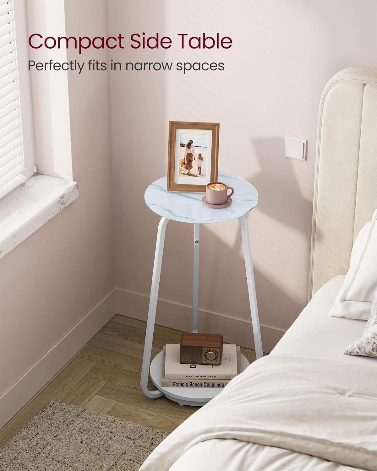 Title: VASAGLE Round Side Table, 2-Tier Nightstand, End Table with Glass Top and Particleboard Shelf, Cocktail Table, for Living Room, Bedroom, Small Spaces, Modern Style, Marble White ULET287W59